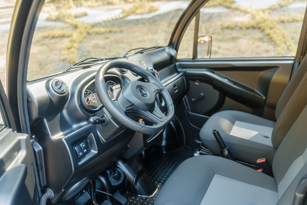 12 Volt Steckdose, Ablagefächer in Türen und vor Beifahrersitz, Abschließbarer Tankdeckel, Armaturenbrett mit moderner, Automobil-Spritzgusstechnik, Außenspiegel links und rechts, Ersatzschlüssel, Fußmatten aus Gummi, Handschuhfach mit Münz- und Getränkehalter, Heckfenster in der Kabine, Heizungslüftung mit zwei Stufen, Innenbeleuchtung mit Türkontaktschaltern, Innenspiegel mit Abblendfunktion, Kopfstützen, Laderaumklappe unter Pritsche abschliessbar, LED-Tagfahrlicht, Lenkradschloss, Luftausströmer links und Mitte, Radiovorbereitung, Radzierblenden, Rückfahrscheinwerfer rechts, Nebelschlussleuchte links, Nutzlastbefestigungshaken (4 Stk.), Schalldämmung Fahrgastzelle, Motorraum und Kabinendach, Schalthebel in Armaturenbrett, Scheibenwischer mit Doppelarm inkl. Intervallschaltung und elektrischer Scheibenwaschanlage, Sicherheitsgurte Automatik, Signalhorn elektrisch, Signalton «Licht an», Sitze in Längsrichtung verstellbar, Sonnenblende Fahrer und Beifahrer, Stahlfelgen 13 Zoll, Tageskilometerzähler, Türgriffe außen schwarz samt, Warnblinkanlage mit automatischer Aktivierung bei Vollbremsung, Wegfahrsperre bei eingelegtem Gang, Zentralverriegelung mit Funkschlüssel sowie Türverrieglung elektrisch vom Fahrersitz bedienbar